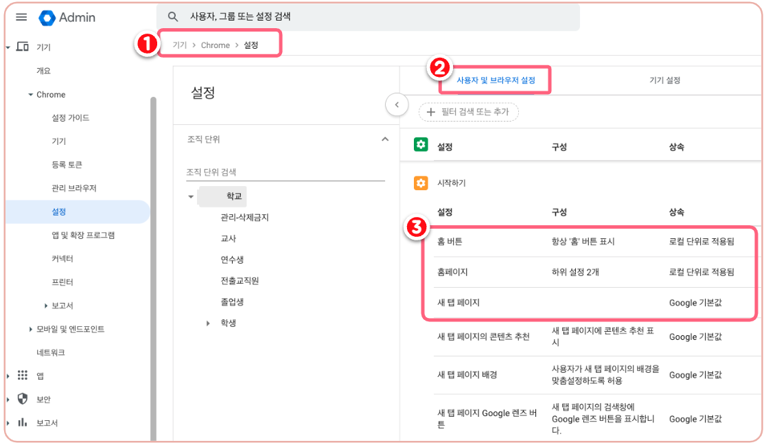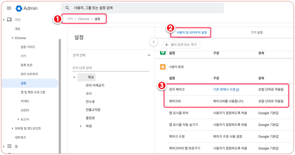 관리자 로그인 - 관리콘솔 - 기기 - 크롬 - 설정 - 사용자 및 브라우저 설정 - 사용자 환경에서